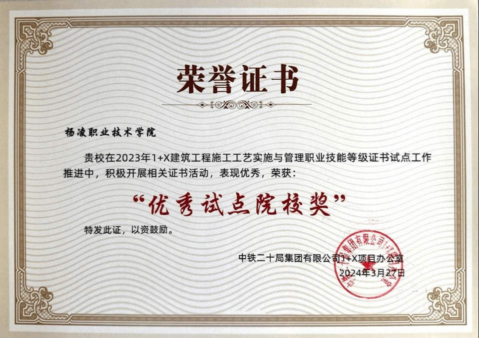 近日,中铁二十局集团有限公司“1+X”项目办公室公布了“2023年度建筑工程施工工艺实施与管理职业技能等级证书优秀单位”名单,学校获评2023年度“优秀试点院校”和“优秀省级考务管理中心”。