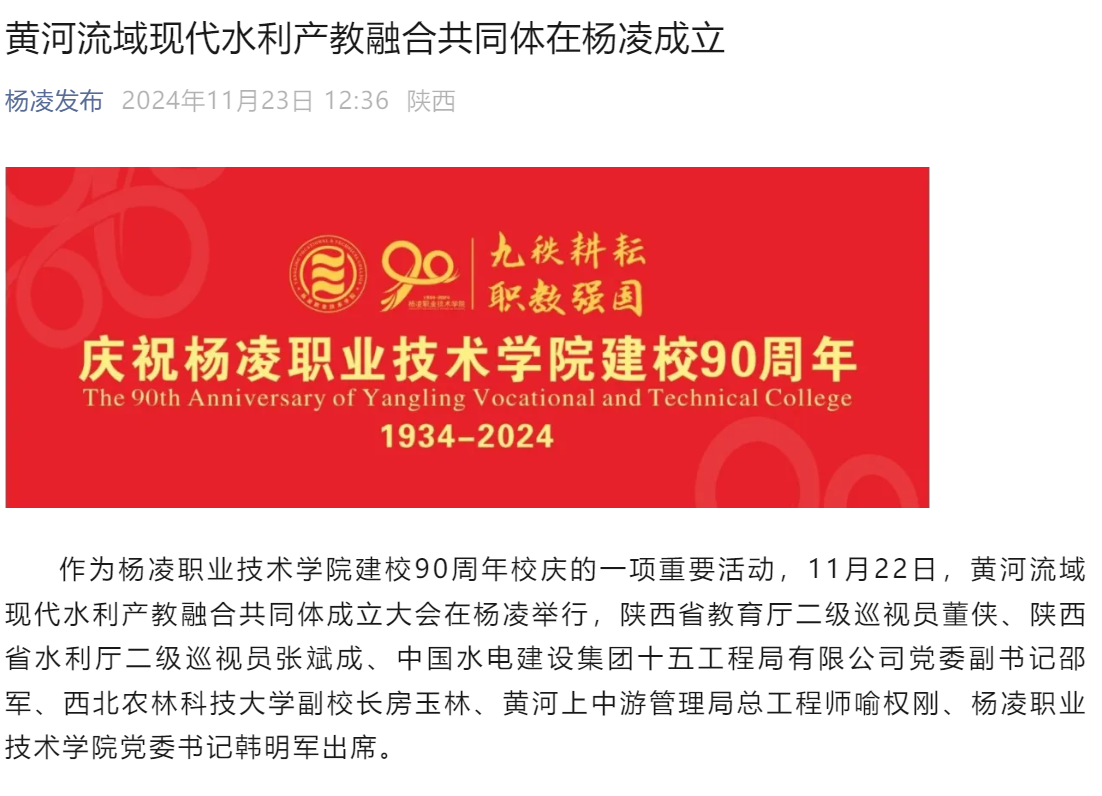 黄河流域现代水利产教融合共同体是以中国水电建设集团十五工程局有限公司、西北农林科技大学、德赢官网Vwin为牵头单位,联合黄河流域10余个省市上下游企业、院校、行业组织和科研机构等40余家单位共同组建成立。